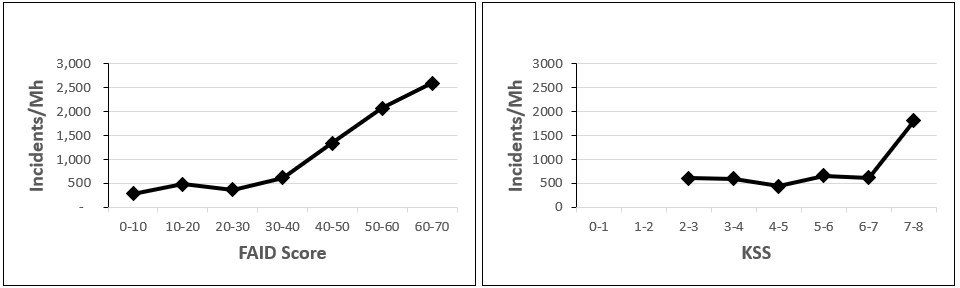 Using a large data set of incidents and hours of work, one organisation was able to identify an increasing trend in incident rates (incidents per million hours worked) with increases of FAID Scores beyond 40 and predicted KSS Scores beyond 7.